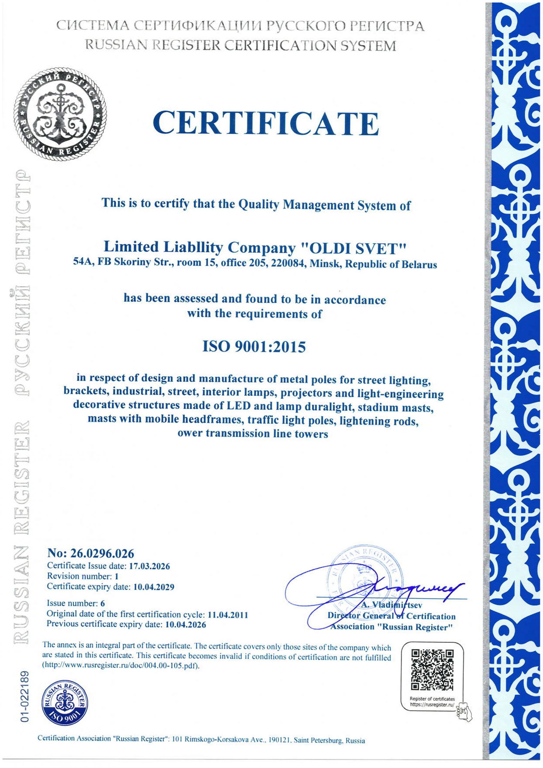 Rzetelne podejście do procesu produkcyjnego pozwoliło naszej firmie uzyskać certyfikat jakości, wydany przez niezależnych ekspertów Stowarzyszenia Certyfikacji „Russkiy Register”. Fakt ten potwierdza, że nasz system zarządzania jakością na wszystkich etapach produkcji jest naprawdę bardzo skuteczny i zgodny ze standardami ISO 9001.